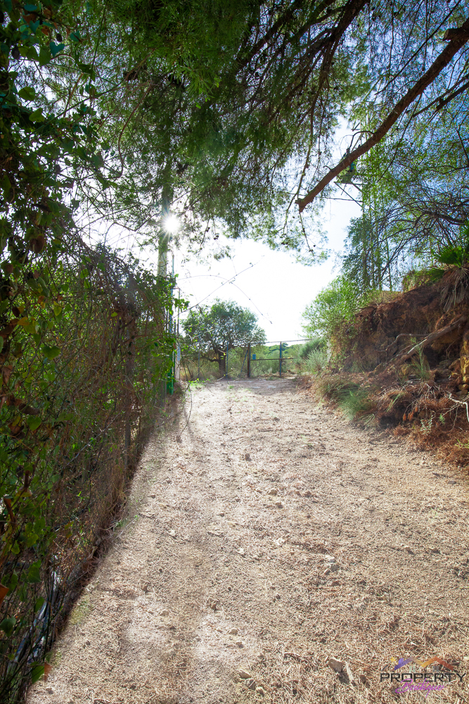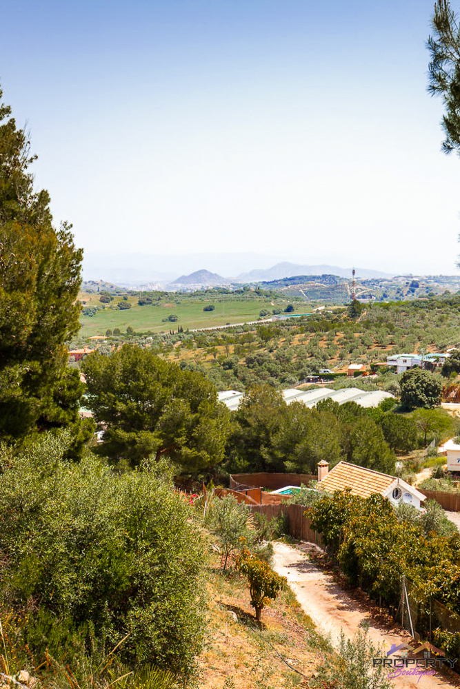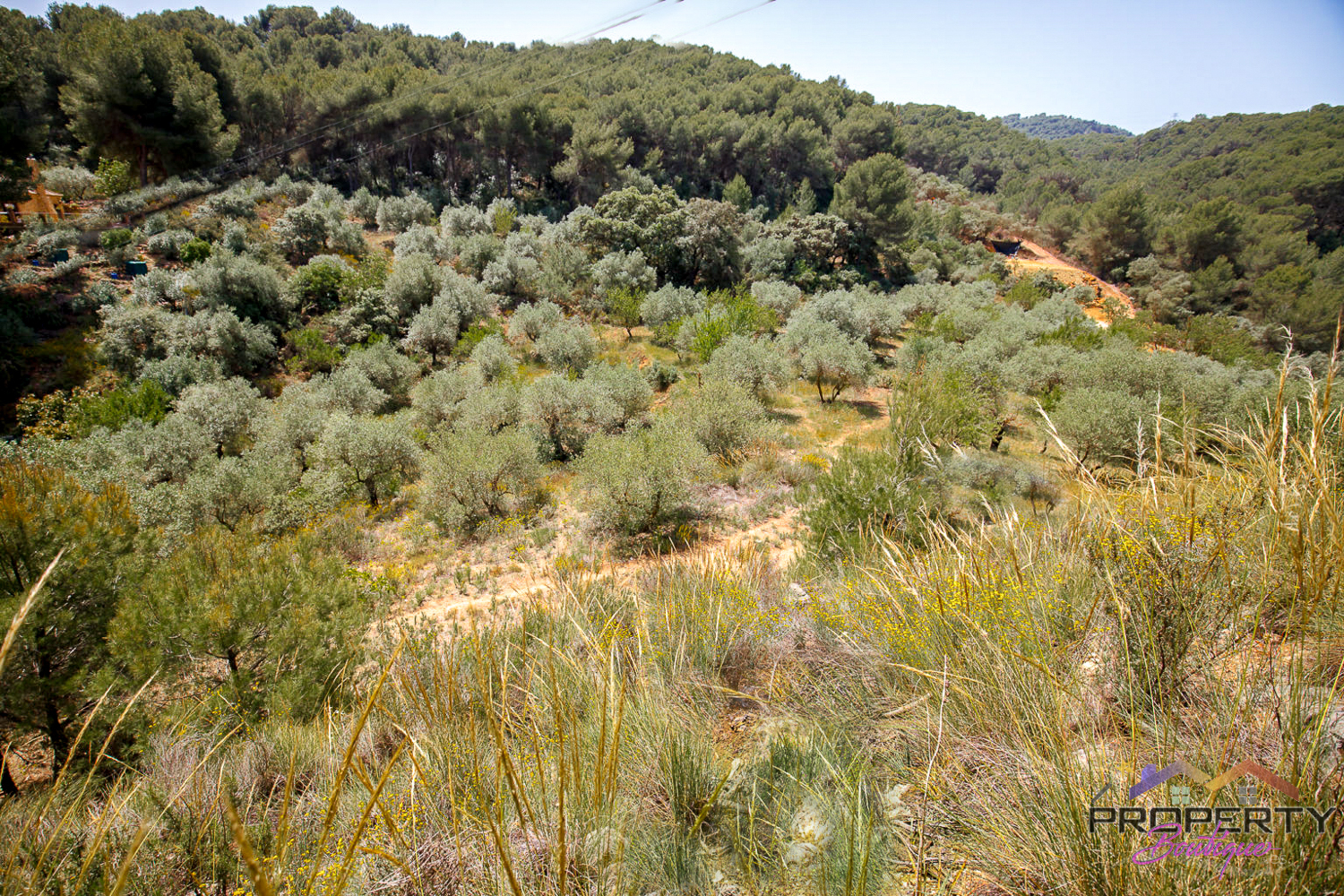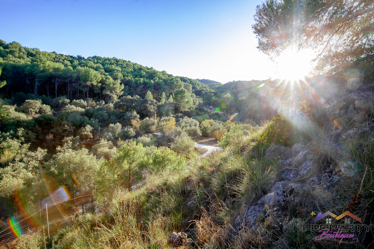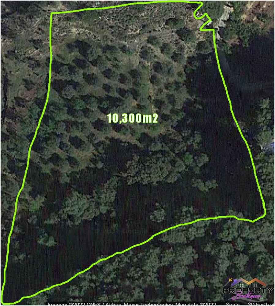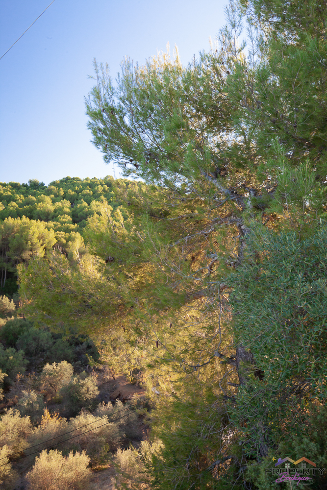 Ideally located between Malaga & just 18km from Marbella, it has 3 access routes (easiest just 350m from the Ojén main road behind Monda BP at the end of a short concrete track). The plot is shielded by a mountainside (so totally quiet), it’s fenced & gated land in a private valley on the edge of the pine forest with lots of privacy and yet mountain & woodland surroundings and views over Coin. Currently it has some olive & almond trees (with others springing up) and the pine tree forest surroundings are simply picturesque.