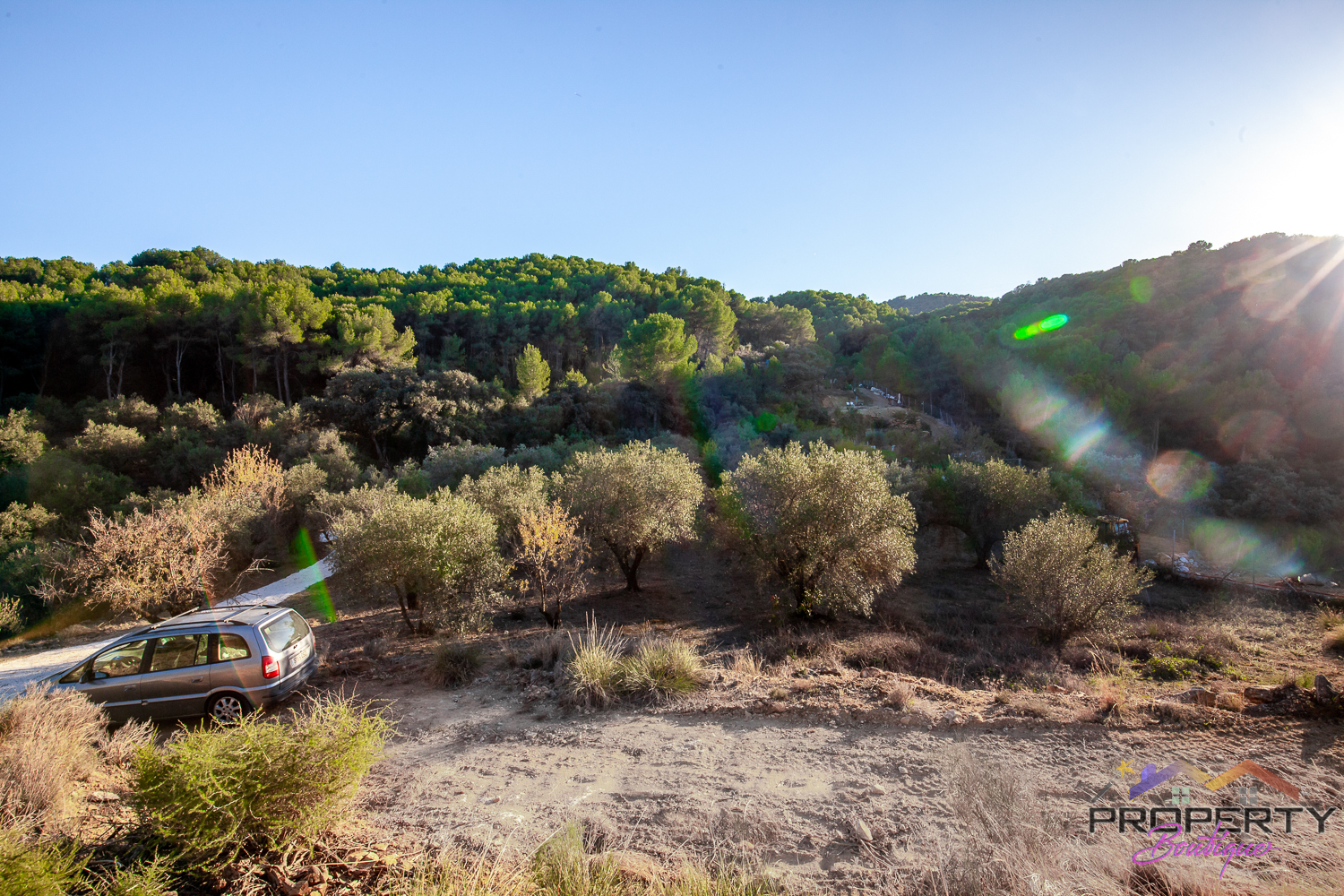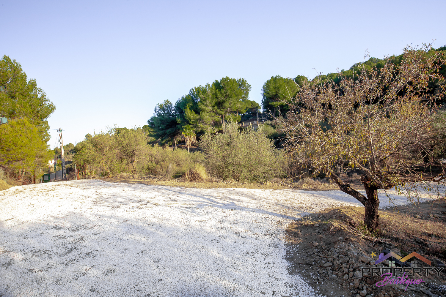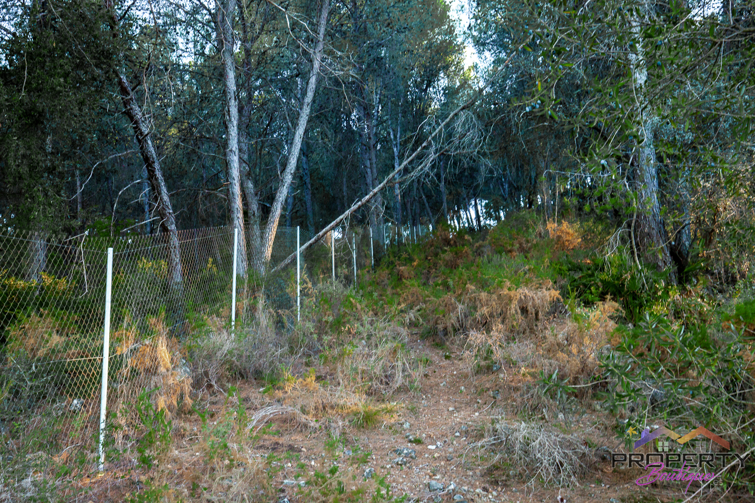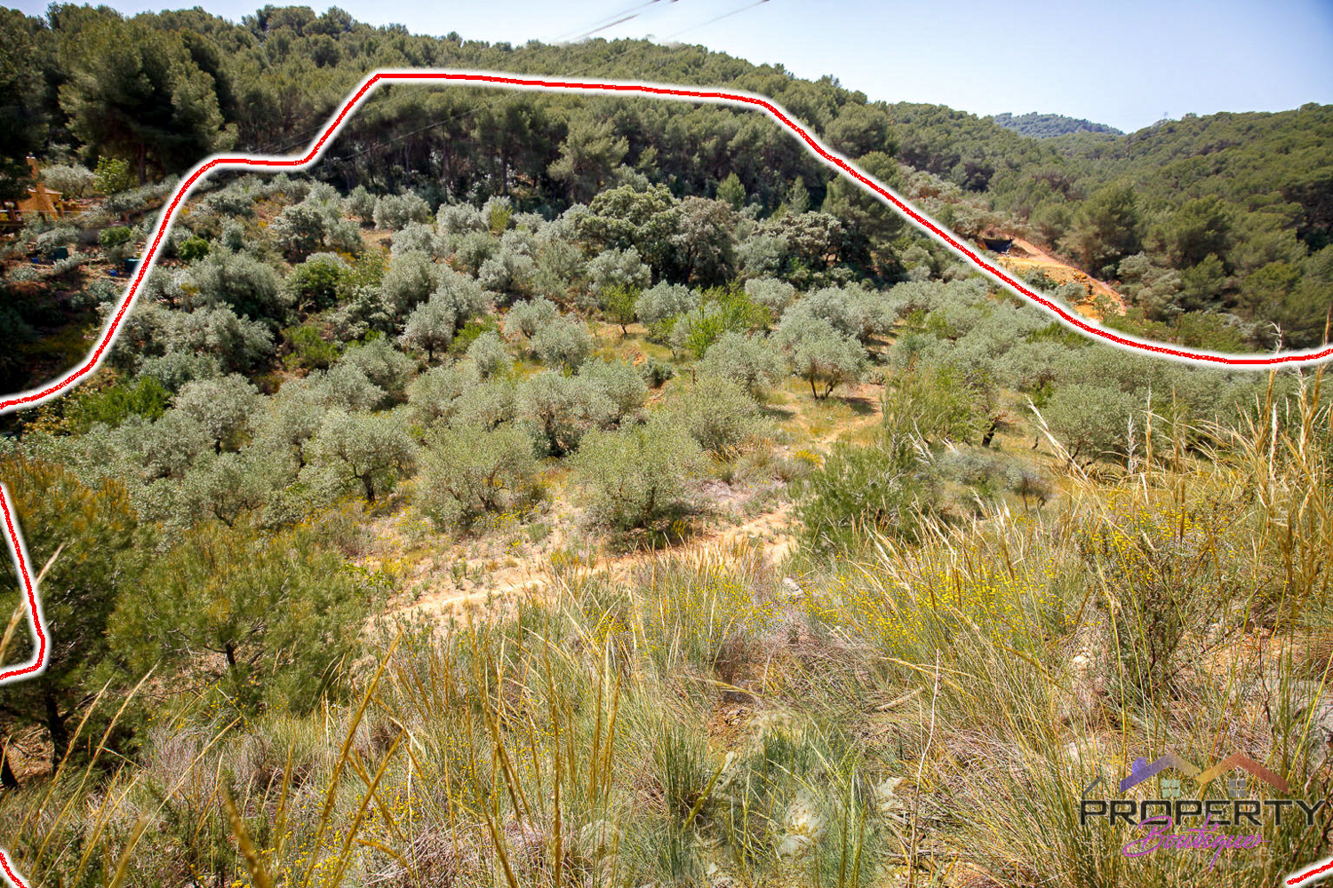 Ideally located between Malaga & just 18km from Marbella, it has 3 access routes (easiest just 350m from the Ojén main road behind Monda BP at the end of a short concrete track). The plot is shielded by a mountainside (so totally quiet), it’s fenced & gated land in a private valley on the edge of the pine forest with lots of privacy and yet mountain & woodland surroundings and views over Coin. Currently it has some olive & almond trees (with others springing up) and the pine tree forest surroundings are simply picturesque.