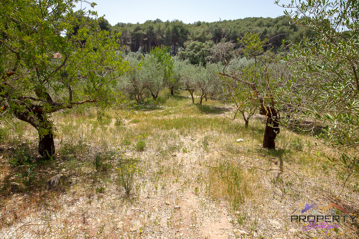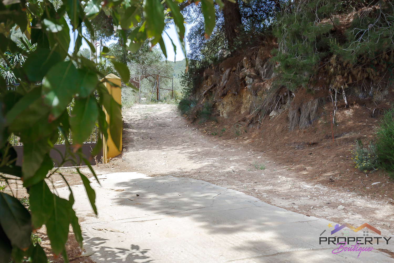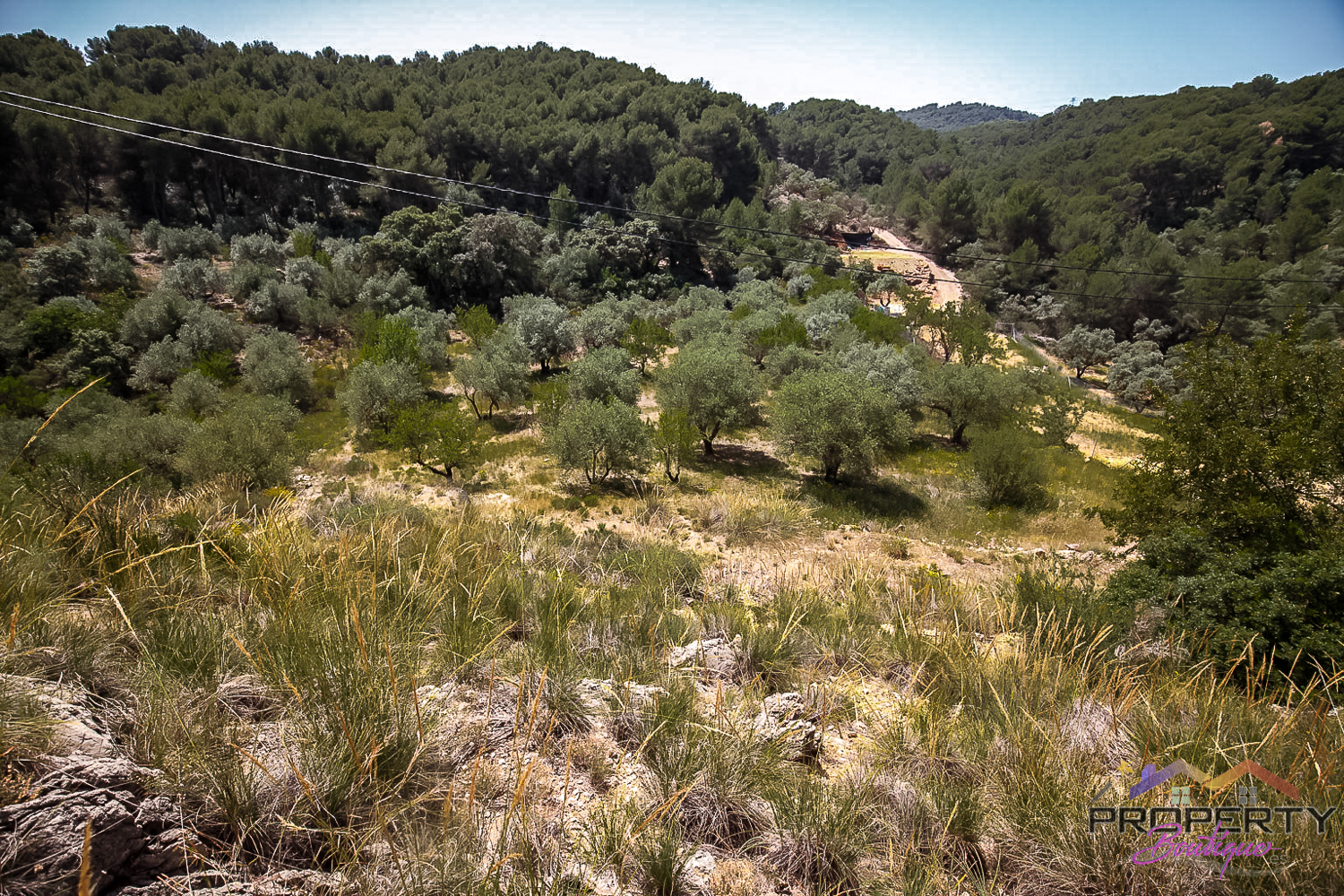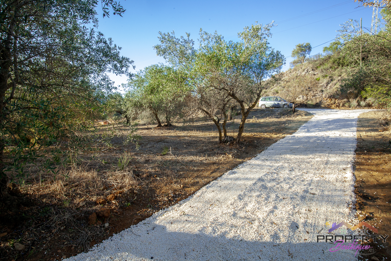 Ideally located between Malaga & just 18km from Marbella, it has 3 access routes (easiest just 350m from the Ojén main road behind Monda BP at the end of a short concrete track). The plot is shielded by a mountainside (so totally quiet), it’s fenced & gated land in a private valley on the edge of the pine forest with lots of privacy and yet mountain & woodland surroundings and views over Coin. Currently it has some olive & almond trees (with others springing up) and the pine tree forest surroundings are simply picturesque.