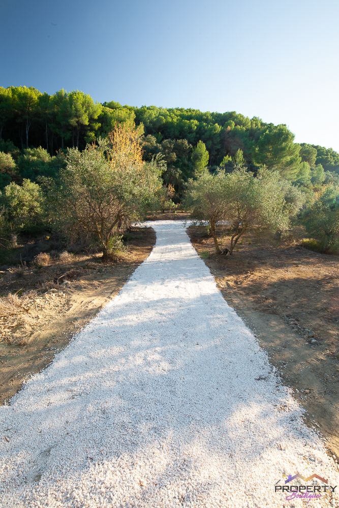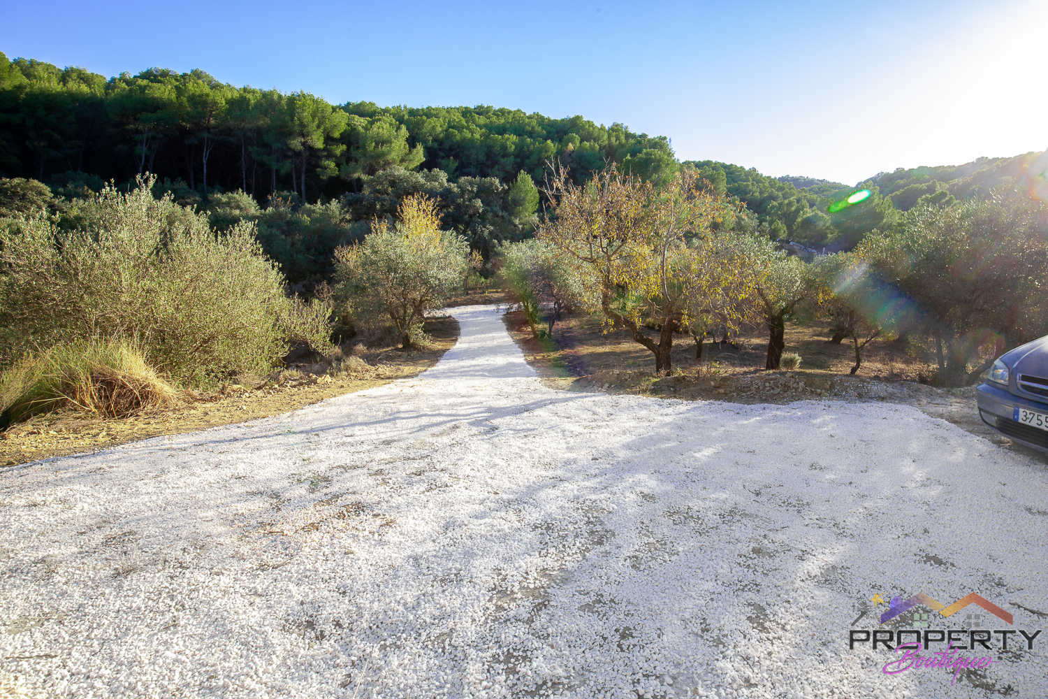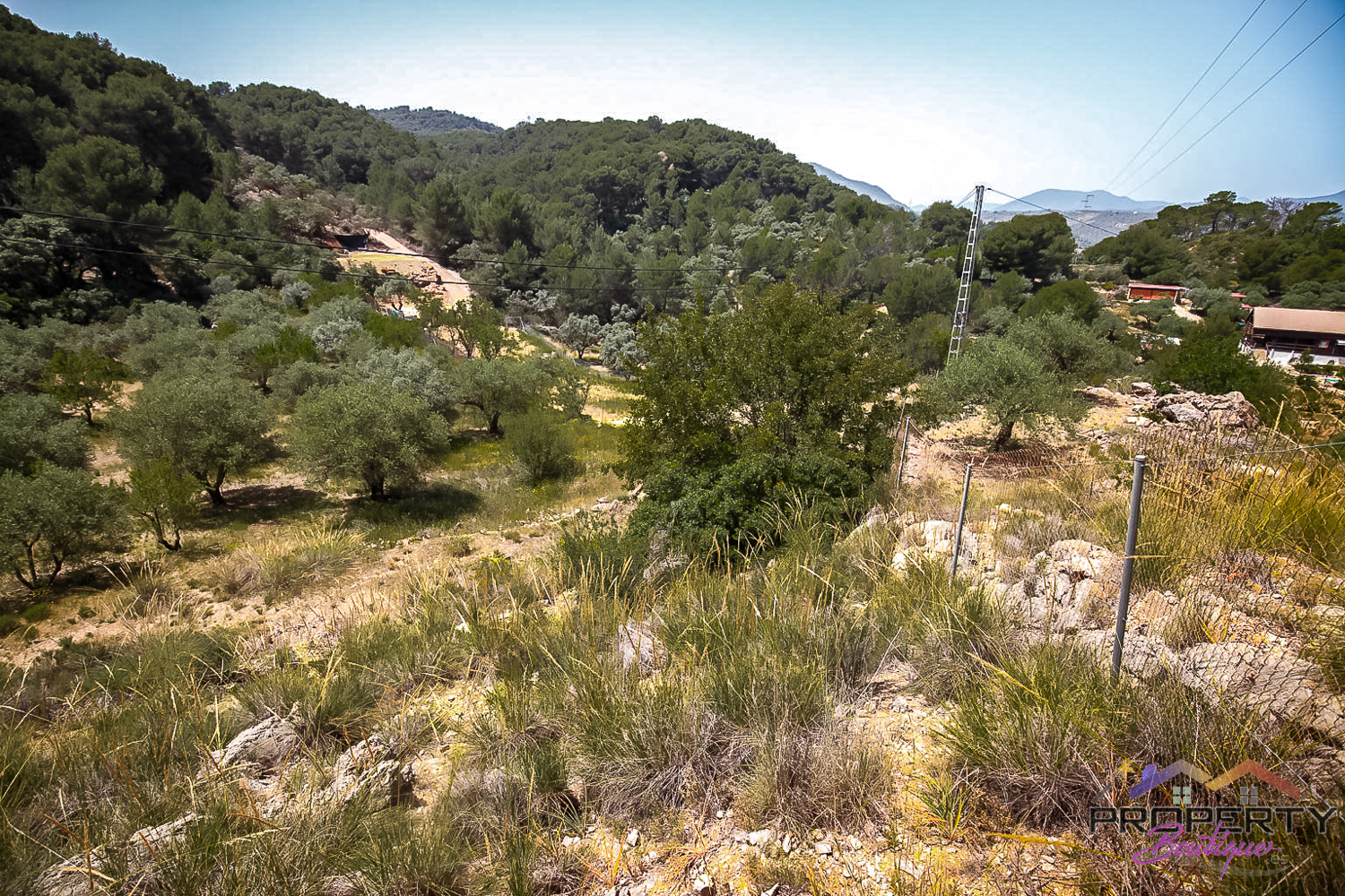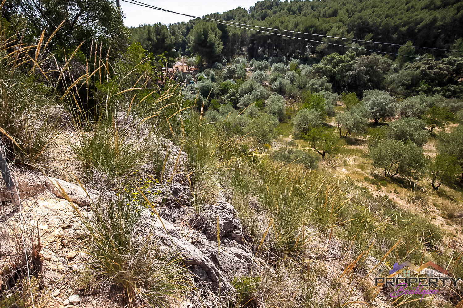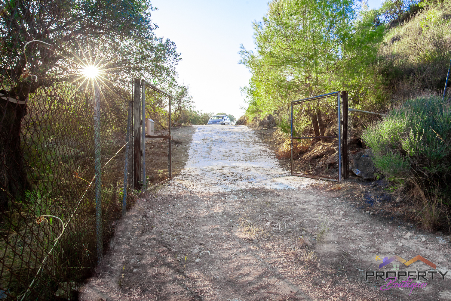 Ideally located between Malaga & just 18km from Marbella, it has 3 access routes (easiest just 350m from the Ojén main road behind Monda BP at the end of a short concrete track). The plot is shielded by a mountainside (so totally quiet), it’s fenced & gated land in a private valley on the edge of the pine forest with lots of privacy and yet mountain & woodland surroundings and views over Coin. Currently it has some olive & almond trees (with others springing up) and the pine tree forest surroundings are simply picturesque.